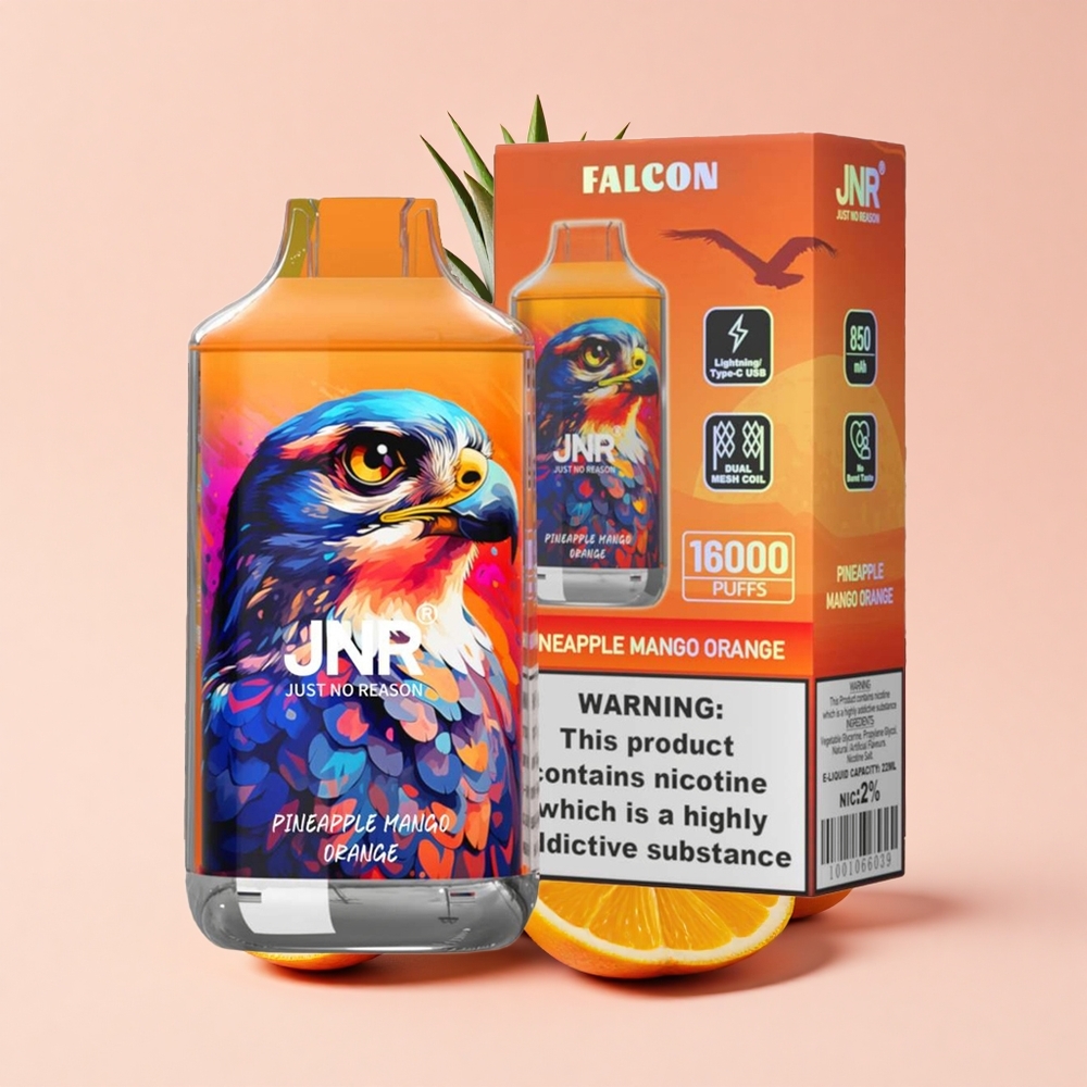 JNR Falcon 16000 Puff أناناس مانجو برتقال 850بطارية مللي أمبير 22ml Dual Mesh Type C LED 0%2%