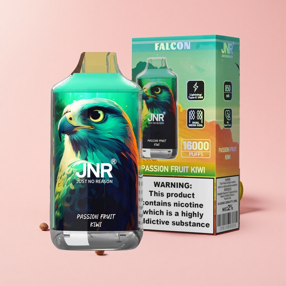 JNR Falcon 16000 Puffs فاكهة العاطفة والكيوي 850بطارية مللي أمبير 22ml Dual Mesh Coil Type C LED